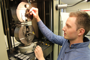 Projektmitarbeiter Sascha Wörner bei der Aufnahme quasistatischer Werkstoffkennwerte im Zugversuch