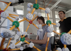 Der Sprecher des gerade verlängerten Schwerpunktprogramms Prof. Dr.-Ing Lothar Wondraczek (rechts) und Doktorand René Limbach in einem Labor der Universität Jena; im Vordergrund ein Atommodell von Glas / Bildquelle: Jan-Peter Kasper/FSU