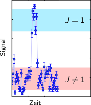 Typisches Detektionssignal, in dem ein Quantensprung in den (J = 1)-Rotationszustand (Sprung vom roten zum blauen Bereich) des Moleküls und aus ihm heraus (blau nach rot) zu sehen ist / Bildquelle: PTB