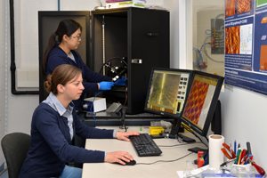 Sarah Wieghold (vorne) und Juan Li am Rastertunnelmikroskop / Bildquelle: Andreas Battenberg / TUM