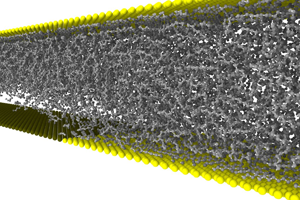 Die Material- und Reibungsforscher wollten wissen, welchen Einfluss chemisch unterschiedliche Oberflächen auf das Fließverhalten eines Schmierstoffs haben. Insbesondere interessierte sie das Verhalten in nanometerbreiten Schmierspalten, einem kritischen Fall nah an der Grenzreibung, das heißt kurz vor dem direkten Kontakt zwischen Oberflächen. Dazu stellten sie ein mathematisches Modell auf, in welchem sie die Viskosität des Schmierstoffs und die Oberflächeneigenschaften der Wände variierten. Nach Dr. Lars Pastewka und Prof. Peter Gumbsch vom Institut für Angewandte Materialien des KIT entstand in der Simulation dann am Übergang der Oberflächen – also der Grenze zwischen Öl-anziehend und Öl-abstoßend – Kavitation.