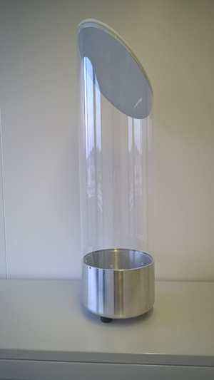 Der komplette Radarscanner: Im unteren silbernen Bereich befindet sich das Radarmodul, oben ist der Spiegel befestigt