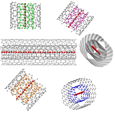 Schematische Darstellung eingeschlossener ultralanger, linearer, sp-hybridisierter Kohlenstoffketten in verschiedenen doppelwandigen Kohlenstoffnanoröhren / Bildquelle: Lei Shi / Fakultät für Physik, Universität Wien