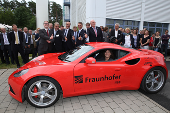Ehrengäste der Grundsteinlegung waren Bayerns Wirtschaftsministerin Ilse Aigner, der Parlamentarische Staatssekretär im BMBF Stefan Müller, Erlangens Oberbürgermeister Dr. Florian Janik, der Vizepräsident der Universität Erlangen-Nürnberg Prof. Günter Leugering sowie Fraunhofer-Vorstandsmitglied Prof. Alexander Kurz. Sie konnten sich bei der Veranstaltung von den Kompetenzen des IISB im Bereich energieeffizienter Elektroniksysteme überzeugen. So war der am Institut komplett selbst entwickelte, straßenzugelassene Elektrosportwagen IISB-ONE in Aktion zu sehen. Ebenso wurde ein neu aufgebautes, in einen Container integriertes Energiespeichersystem für Industrieanwendungen präsentiert, das direkt an das lokale Gleichstromnetz des IISB angebunden ist. Das im Rahmen des Leistungszentrums Elektroniksysteme (LZE) entwickelte Langzeitspeichersystem beruht auf der Erzeugung und Verstromung von Wasserstoff, der in einer organischen Trägerflüssigkeit (LOHC: Liquid Organic Hydrogen Carrier) gespeichert wird.