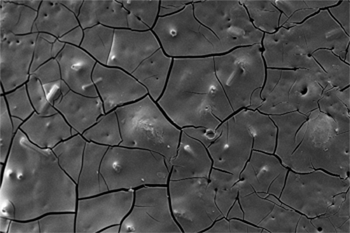 REM-Bild des gleichen Implantats nach fünf Tagen im Wasserbad: Die dicke Schutzschicht hat sich fast vollkommen abgelöst, nur noch kugelförmige Reste der Tannin-Gentamicin-Schicht sind zu erkennen / Bildquelle: Innovent Technologieentwicklung Jena