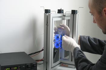 Die Arbeiten am Fraunhofer THM verfolgen den Ansatz, pyroelektrische Kristalle im direkten Kontakt mit Wasser einem Temperaturwechsel auszusetzen. Die damit einhergehende Änderung der Oberflächenpotentiale von beispielsweise Bariumtitanatkristallen (BaTiO3) ermöglicht eine Reaktion der adsorbierten Wasserstoff- und Sauerstoffionen oder –Moleküle zur Bildung von gasförmigem Wasserstoff und Sauerstoff. Eine vorab durchgeführte theoretische Studie zu diesem Prozess zeigte, dass dafür eine sehr große wirksame Oberfläche der pyroelektrischen Kristalle nötig ist und die Temperaturwechsel mit hoher Frequenz erfolgen müssen, um in den Bereich messbarer Wasserstoffkonzentrationen zu gelangen. Für eine relevante Produktionsmenge aus Sicht einer technischen Nutzung, zum Beispiel zur Wandlung von Niedertemperaturabwärme in chemische Energie, wären diese Werte noch weitaus größer. Rico Belitz und seine Kolleginnen und Kollegen vom Fraunhofer THM und vom Kurt-Schwabe-Institut für Mess- und Sensortechnik e.V. in Meinsberg hatten hier vorläufig das Ziel, das Funktionsprinzip mit einem Labordemonstrator nachzuweisen.