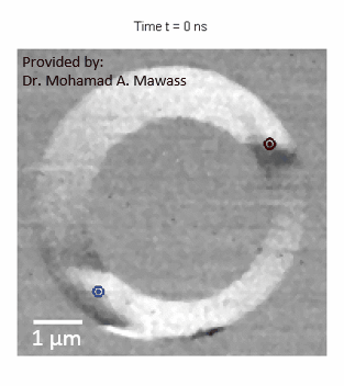 An der Maxymus-Beamline von BESSY II konnte das Team mit Hilfe von zeitaufgelöster Röntgen-Mikroskopie beobachten, wie sich die Magnetisierung entwickelt, nachdem der kurze Magnetfeldpuls angelegt wurde: So bilden sich durch den magnetischen Puls zunächst zwei Domänenwände im Ring aus. Sobald das äußere magnetische Feld abgeschaltet wird, bewegen sich die Domänenwände sehr schnell aufeinander zu und vernichten sich. Dadurch dreht sich die Magnetisierung vom Uhrzeigersinn in die Gegenrichtung um.