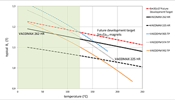 Die Magnete zeichnen sich durch eine besonders hohe Koerzitivfeldstärke bei gleichzeitig hoher Sättigungspolarisation sowie hohe Temperatur- und Korrosionsbeständigkeit aus. Derzeit arbeitet das Unternehmen mit VACOMAX 262 HRP an einer Weiterentwicklung des Produktes. Ziel ist eine Realisierung höherer Remanenz-Werte und Energiedichte. Bereits ab Temperaturen über 130 °C bietet VACOMAX 262 HRP aufgrund des niedrigen Temperaturkoeffizienten der Remanenz höhere Flusswerte als herkömmliche Nd-Fe-B Legierungen, das nächste Entwicklungsziel ist es, die magnetischen Eigenschaften auf Br min = 1,19 T anzuheben.