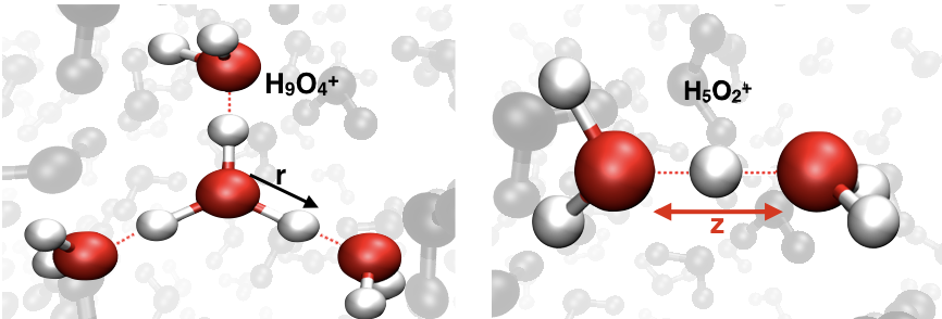 Protonen in Wasser werden üblicherweise durch die beiden in Abb. 1A gezeigten Grenzstrukturen beschrieben. Im sogenannten Eigen-Komplex (H9O4+) (links) ist das Proton Teil des zentralen H3O+-Moleküls, das von drei Wassermolekülen umgeben ist. Im Zundel-Kation (H5O2+) (rechts) bildet das Proton zwei starke Wasserstoffbrücken mit zwei benachbarten Wassermolekülen. Zur Beschreibung dieser Systeme auf molekularem Niveau wird die Energiepotentialfläche des Protons verwendet (Abb. 1B), die sich für die beiden Geometrien deutlich unterscheidet. Für den Eigenkomplex erwartet man ein anharmonisches Potential mit einem Minimum während die Zundelgeometrie ein Doppelminimum-Potential aufweisen sollte. In Wasser sind solche Potentiale hochdynamisch und fluktuieren auf schnellen Zeitskalen, ein Verhalten, das durch thermische Bewegungen der umgebenden Wassermoleküle und des Protons verursacht wird.