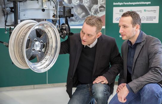 Wissenschaftler des Bundesexzellenzclusters MERGE: Technologiefusion für multifunktionale Leichtbaustrukturen an der Technischen Universität Chemnitz haben gemeinsam mit den Partnern des Fraunhofer-Instituts für Werkzeugmaschinen und Umformtechnik (IWU) einen Leichtbauerfolg mit großer Bedeutung für den Automobilbau der Zukunft erzielt: Sie reduzierten das Gewicht eines Pkw-Rades durch den Einsatz von neuartigen Materialien und Strukturen um mehr als die Hälfte. Im Vergleich zu einem Referenzrad aus Stahl, welches etwa 6,8 Kilogramm auf die Waage bringt, wiegt das neue Leichtbaurad aus Chemnitz nur noch 3,02 Kilogramm. Das dreiteilige Rad besitzt eine Sandwich-Radscheibe aus einem Aluminiumschaumkern und Deckschichten aus thermoplastischen Faser-Kunststoff-Verbunden.