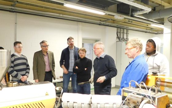 Die Herstellung von Mehrschichtfolien aus Biopolymeren konnten junge Wissenschaftler des Sonderforschungsbereichs (SFB/TRR 102) Polymere unter Zwangsbedingungen im Verarbeitungstechnikum Biopolymere Schwarzheide erleben. Welche Potenziale und Herausforderungen Biopolymere für die Verpackungsindustrie mit sich bringen, erfuhren die Physiker und Chemiker am 21. Februar 2018 beim Besuch des Schwarzheider Standorts des Fraunhofer-Instituts für Angewandte Polymerforschung IAP.
