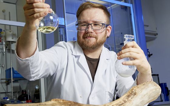Bernhard Stadlers Aufgabe im GreenSolRes-Projekt ist es, Abkömmlinge der Lävulinsäure zu innovativen Materialien zu veredeln. Das gelingt dem Chemiker mittels Katalysatoren sowie neben der Lävulinsäure noch Wasserstoff und Vernetzungsmittel. Zunächst entsteht ein Zwischenprodukt, ein sogenanntes Diol (1,4-Pentandiol), das sich in einem weiteren Schritt zu einem Polyester verbindet. Endprodukt ist eine klare, zähe Flüssigkeit, die sich als Klebstoff eignet. Im ausgehärteten Zustand verhält sich das Material gummiartig.