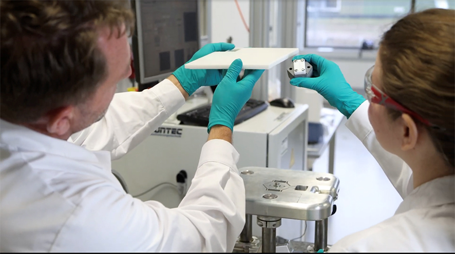 Aus einer Kunsteisplatte wird ein Prüfkörper hergestellt, dessen Gleitverhalten im Eisgleitsimulator gemessen und bewertet wird (Bild: Glice AG)