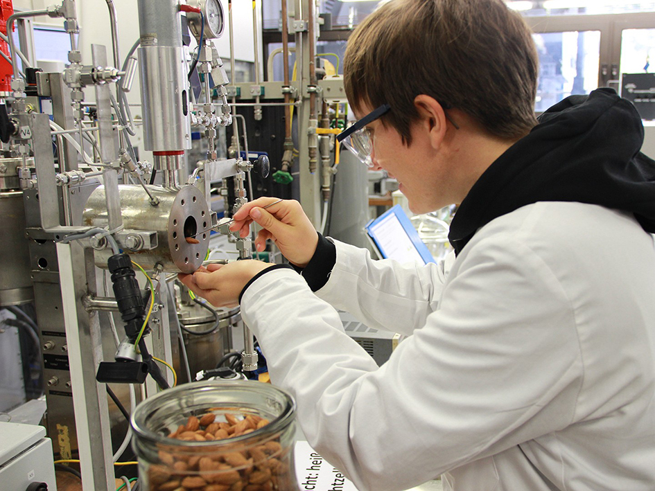 Karen Fuchs im Hochdrucktechnikum bei Vorversuchen an einer 60mL-Hochdrucksichtzelle zur Imprägnierung von Mandeln (Bild: Fraunhofer Umsicht)